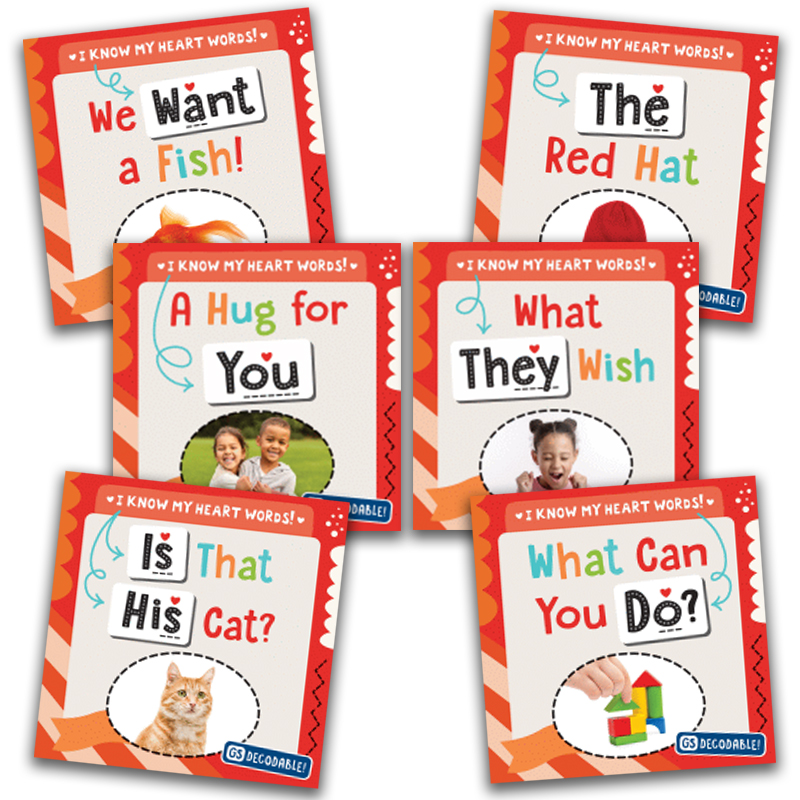 Sometimes called high-frequency words or sight words, heart words are those that new readers have to learn by heart because they are not easily decoded. This set presents heart words in an entirely decodable narrative for children at the beginning of their reading journey. Each book in the set focuses on one to four heart words, each of which is called out every time it is used in the text to call readers’ attention to it.