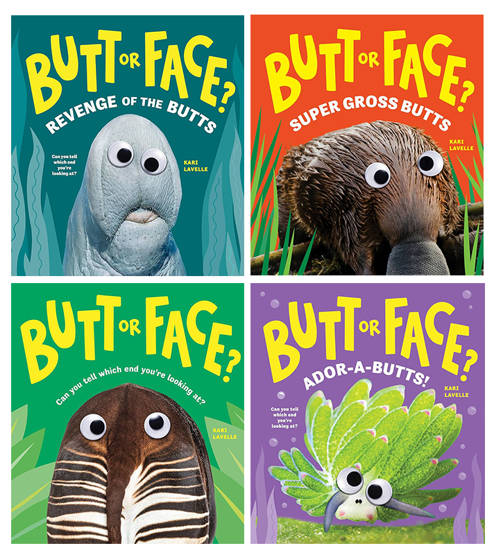 Move over, Jeopardy, Family Feud, and The Price Is Right—this book will be your new favorite laugh-until-your-stomach-hurts family game! In Butt or Face, weird animals are introduced with a close-up photo. Kids must guess: are they seeing seeing…um…err… the bottom or the top?